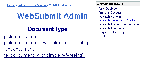 This feature allows you to organise the way webSubmit main page will look like. You will be able to group document types inside catalogues and order the catalogues the way you wish.