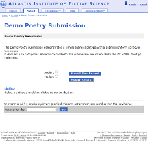 Such a multi-page submission could appear to users as shown in figure 4. Note that this figure shows a special page 0. This "cover" page is mandatory for all submissions, and is automatically generated by WebSubmit. It can be customized to 1) display a description of the submission, 2) show the available "actions" (described further below) and 3) let the users chose among the available "categories" (described further below).